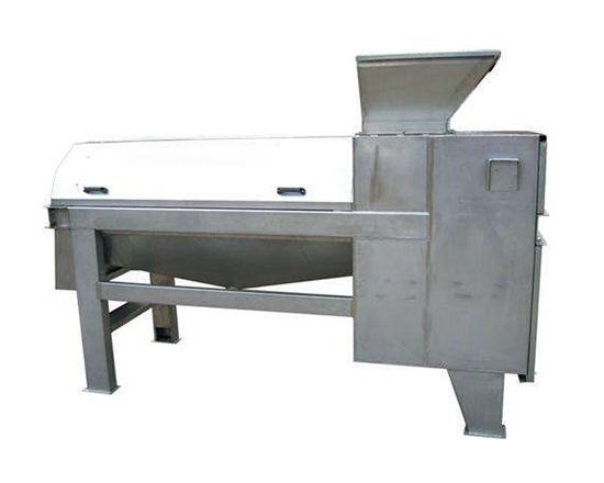 电机通过三角带传动,使转子部件高速旋转,水果由进料口进入机内,送料浆叶将物料螺旋输送至去核棒,在去核棒的作用下,物料被捣烂。由于离心力的作用,物料中的汁液和肉质(已成浆状)通过筛网上的筛孔进入下道工序,核则由出渣浆叶排出出渣口,从而实现浆渣自动分离。当果肉进入二道筒体内时,挡浆盘将物料均匀排发到刮板和筛网之间,由于刮板的回转作用和导程角的存在,使物料沿着园筒向出口端移动,移动的轨迹呈螺旋状,物料就在刮板和筛网之间移动过程中受离心力的作用而被擦碎,汁液和肉质(已成浆状)从筛孔通过进入下道工序,皮和籽等则从出渣斗排出,从而达到自动分离的目的。