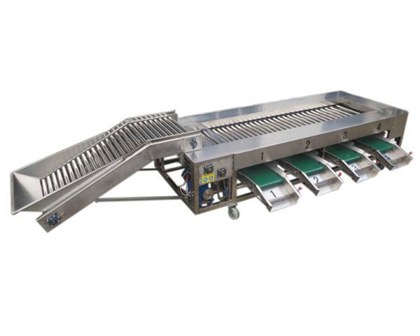 本设备是全不锈钢果蔬分选机械,是由上果输送机和滚杠式分选机组成;上果输送机通过滚杠自动旋转来达到均匀上料,滚杠式分级机根据果蔬直径大小来分选;