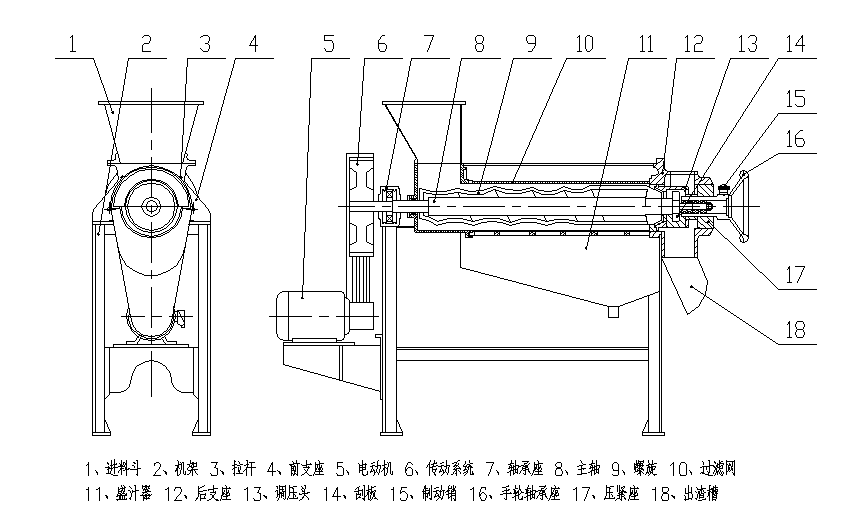 ★ 由前支座、进料斗、螺旋、过滤网、盛汁器、后支座、出渣槽等组成,螺旋主轴左端支撑于滚动轴承座内,右端支撑于手轮轴承座内,电机通过一对三角皮带驱动螺旋进行工作。